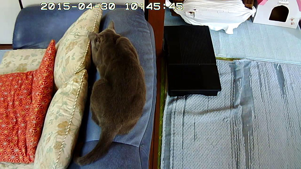 でも夕方、Webカメラで猫たちの様子を見てみたら、やはりロシ子、扇風機の風が当たるこの場所で、ローテーブルの上でベターッてへばっていましたよ。