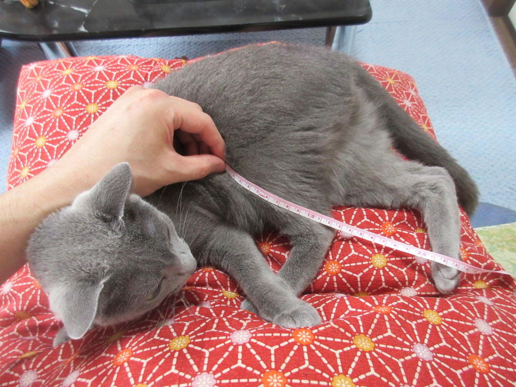 そして、ロシ子の膝と踵の間の長さを測りましたよ…、ロシ子は膝蓋骨脱臼を経験した猫ちゃんで、当時、よくロシ子の膝蓋骨を触っていたので、ロシ子の膝蓋骨を探り出すのはお手の物…。