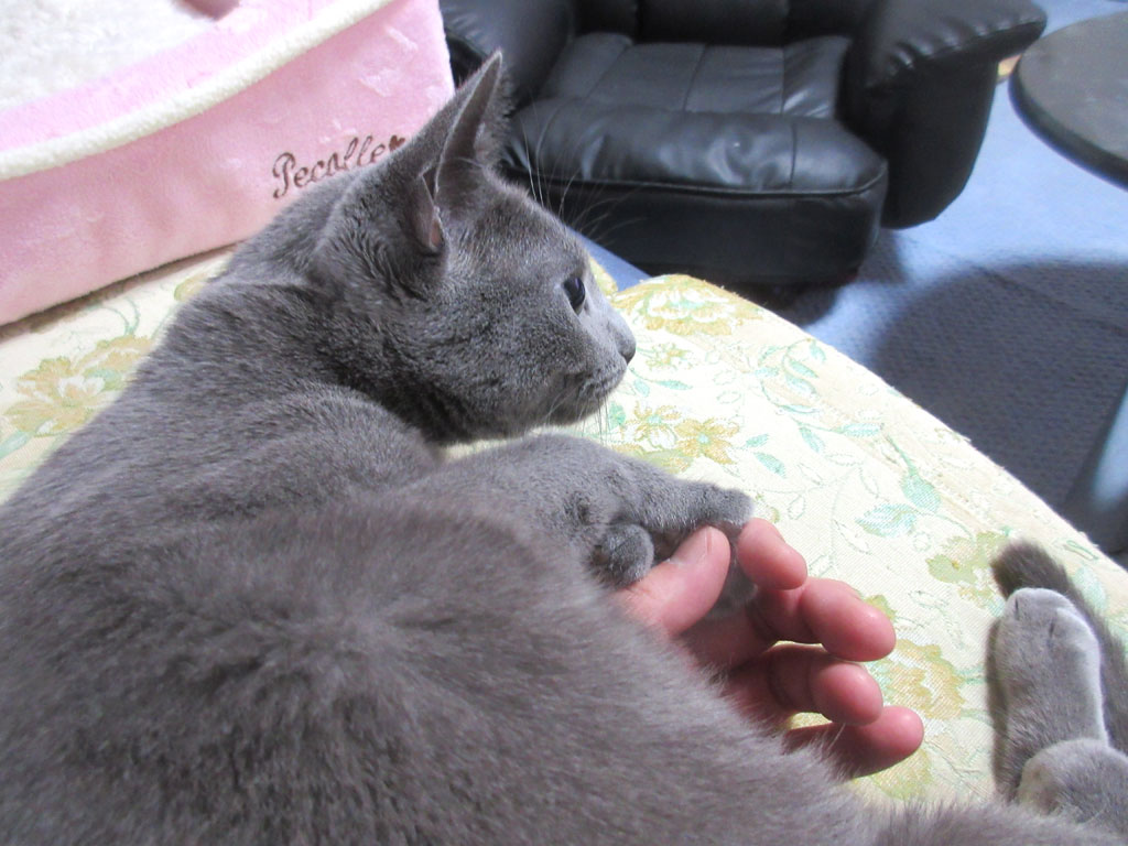 そして、私の隣で寛ぐロシ子…、私、ロシ子と手を繋いで、肉球を押して爪を出して、ロシ子の爪に触るのが好きなのですが、ロシ子には10日に1度の割合で爪切りをしているので、いつも綺麗な爪をしてるんです。