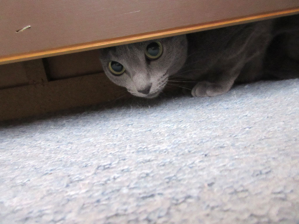 ロシ子は女の子なので、私的には、気の強いテキパキした子よりも、こんな感じのビビりでおっとりした子の方が好みなのですが、まさしくロシ子はそんな子で、見知らぬ声が1階から聞こえて来ただけで、こんな風に隠れてしまうロシ子が、私はとってもかわいくて愛おしいのです。