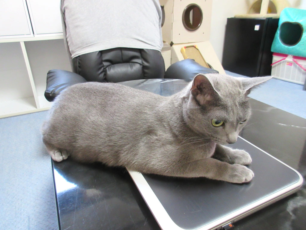 ロシ子の腰の辺りを撫で撫で…、ロシアンブルーはやっぱり、撫で心地が最高です。