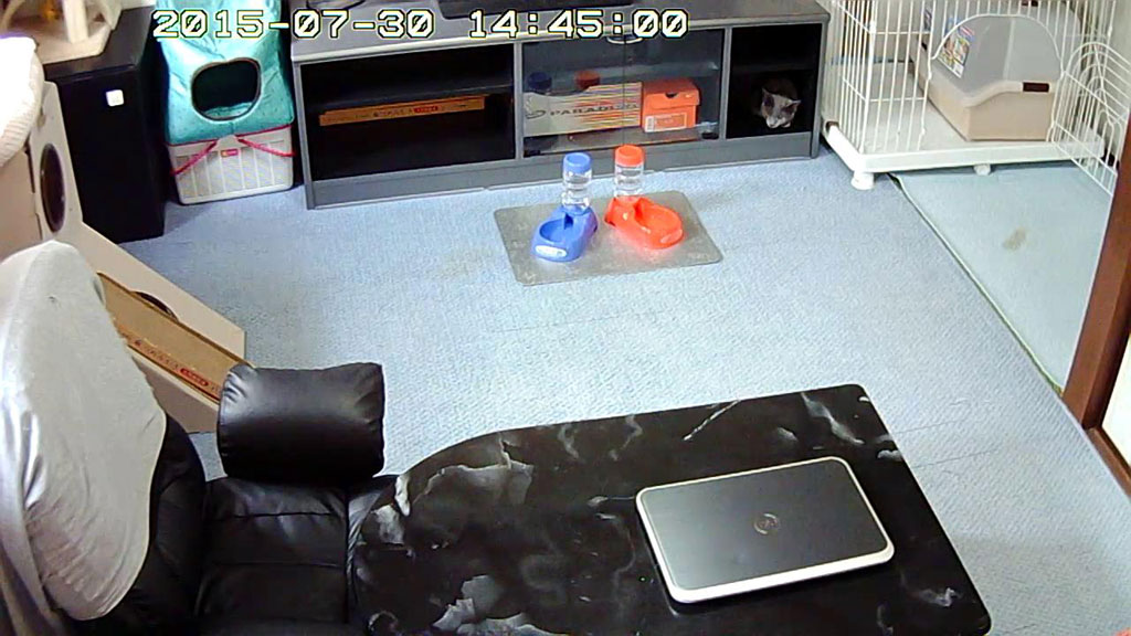 そして、自動給餌器でお昼ご飯を食べた後、ロシ子はまた、このテレビ台の中で横になっていましたよ…、ここが落ち着くのかな…。