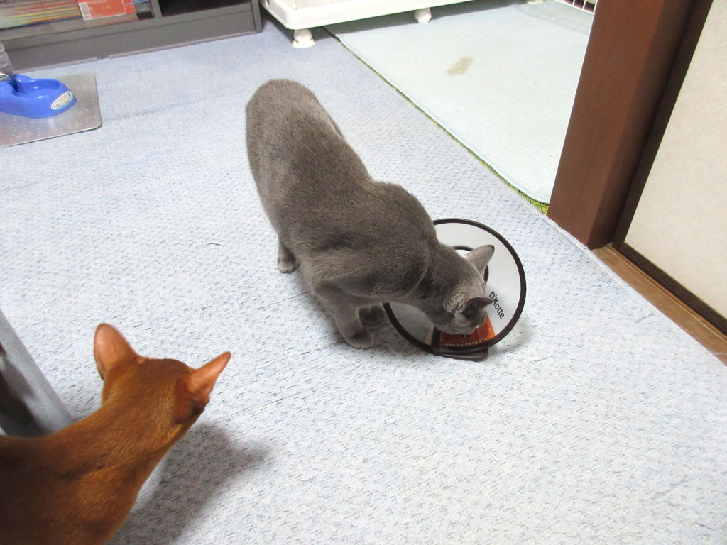それで、アビのすけがその軟膏を舐めない様に、アビのすけにエリザベスカラーをはめたのですが、ロシ子がそのエリザベスカラーに興味津々で、いつもなら、アビのすけがロシ子にちょっかいを掛けるのに、この時ばかりは、ロシ子がアビのすけにちょっかいを掛けまくっていたのです。
