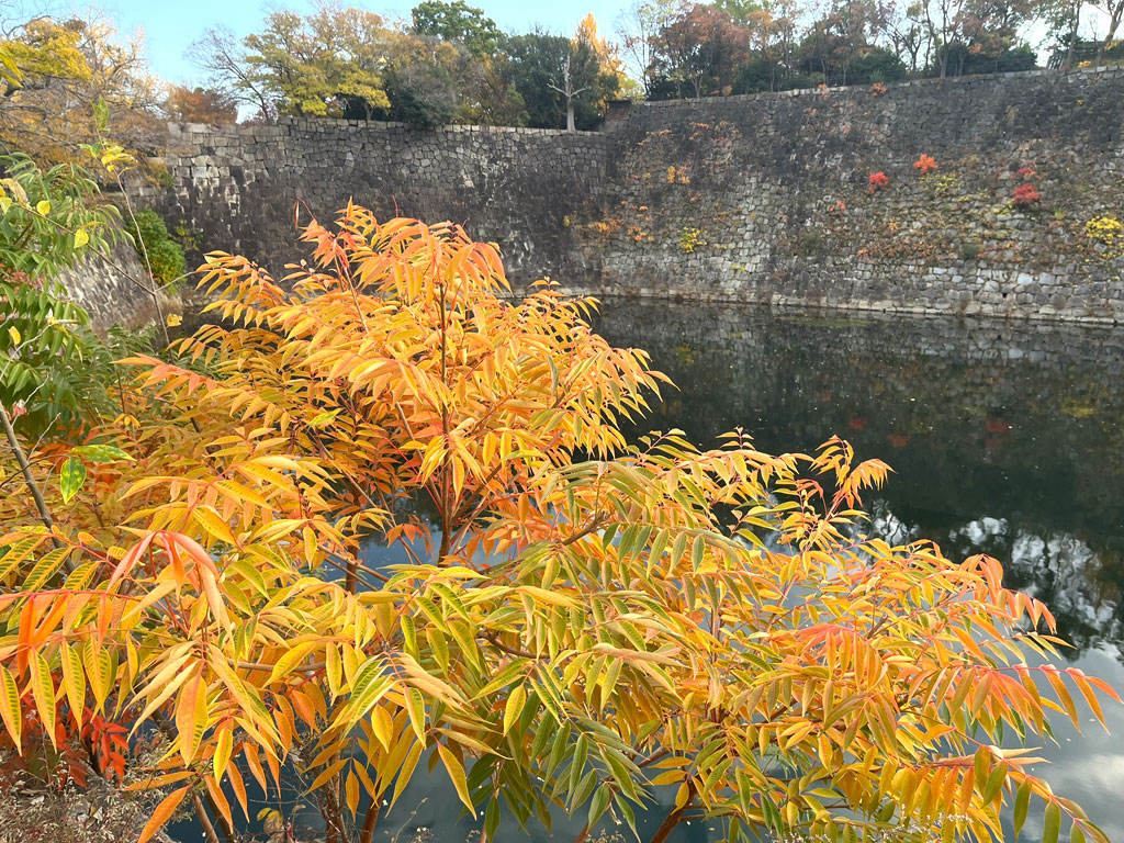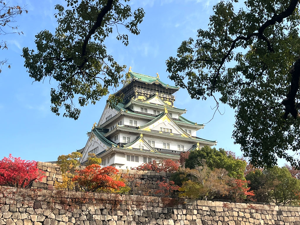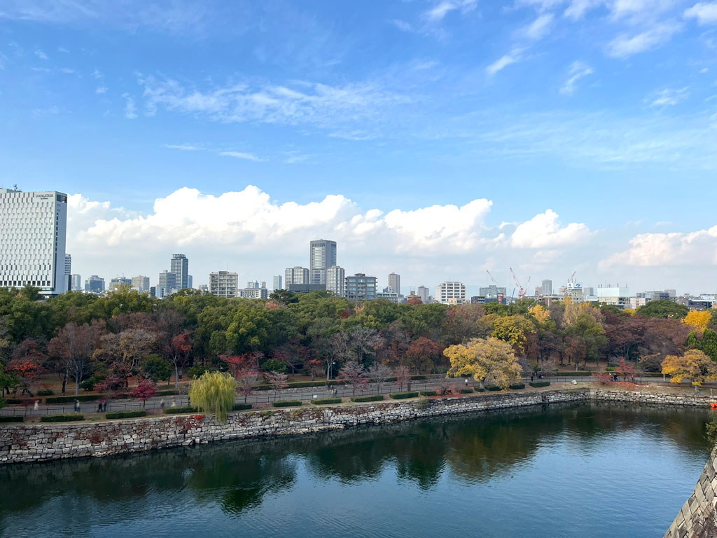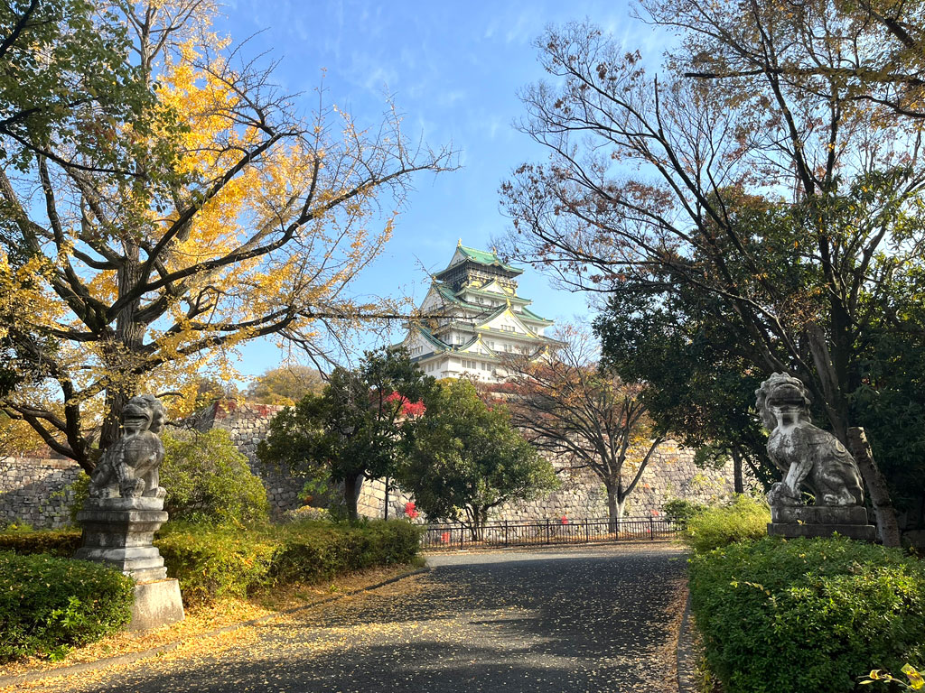 カラフルな木々に彩られて、とてのきれいな大阪城の風景。