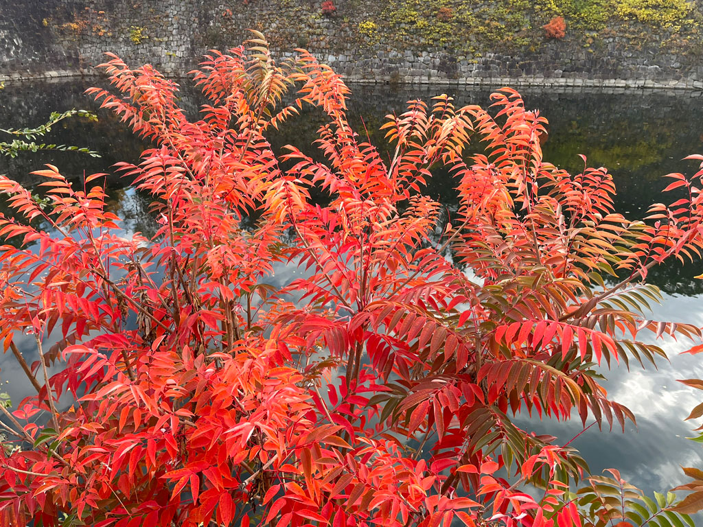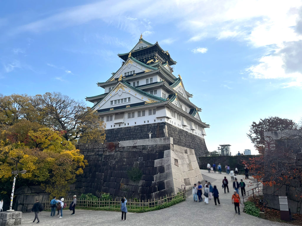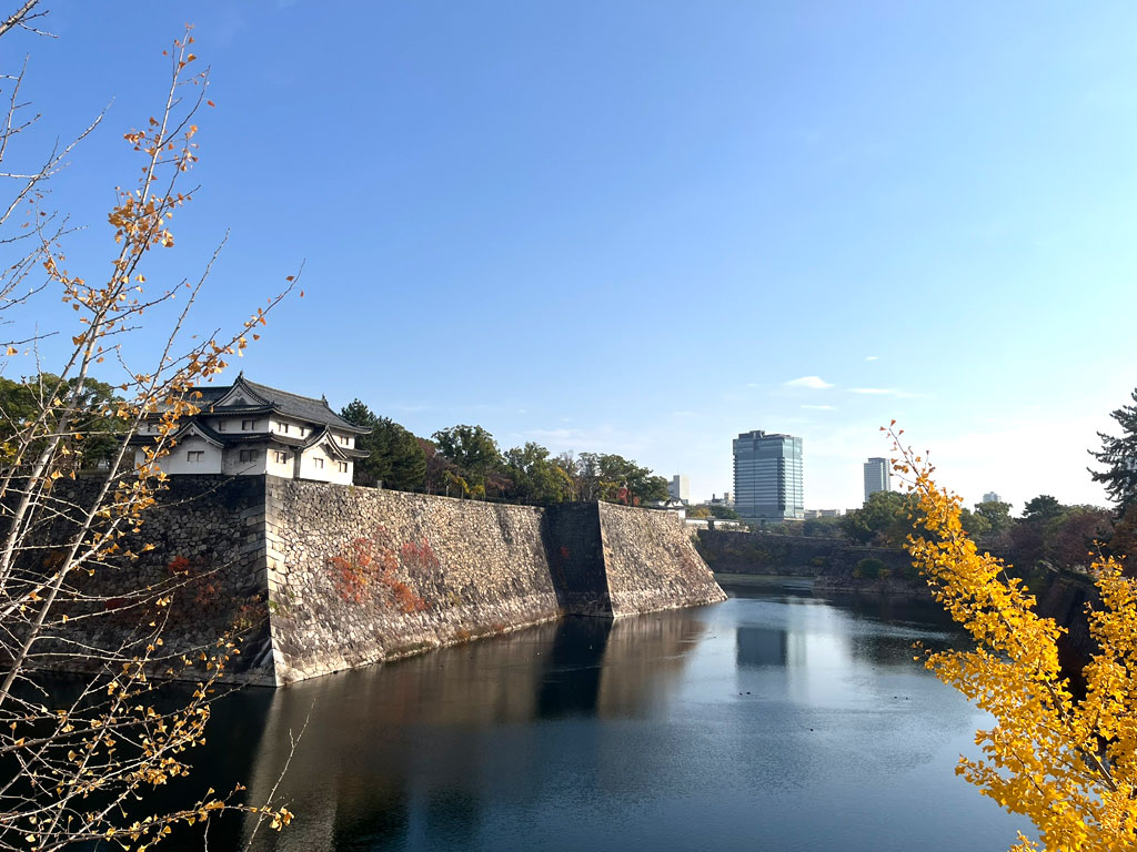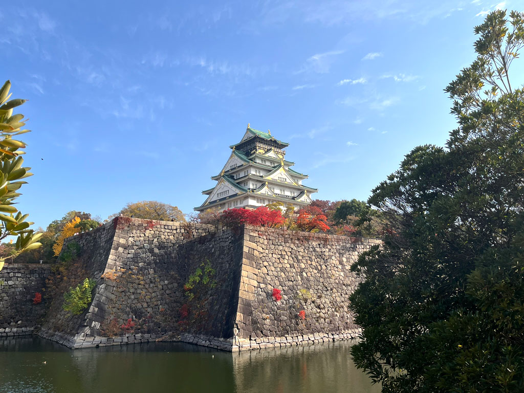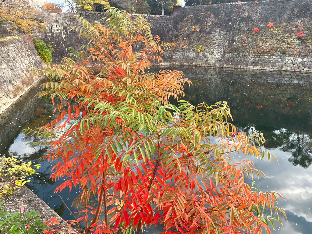 カラフルな木々に彩られて、とてのきれいな大阪城の風景。