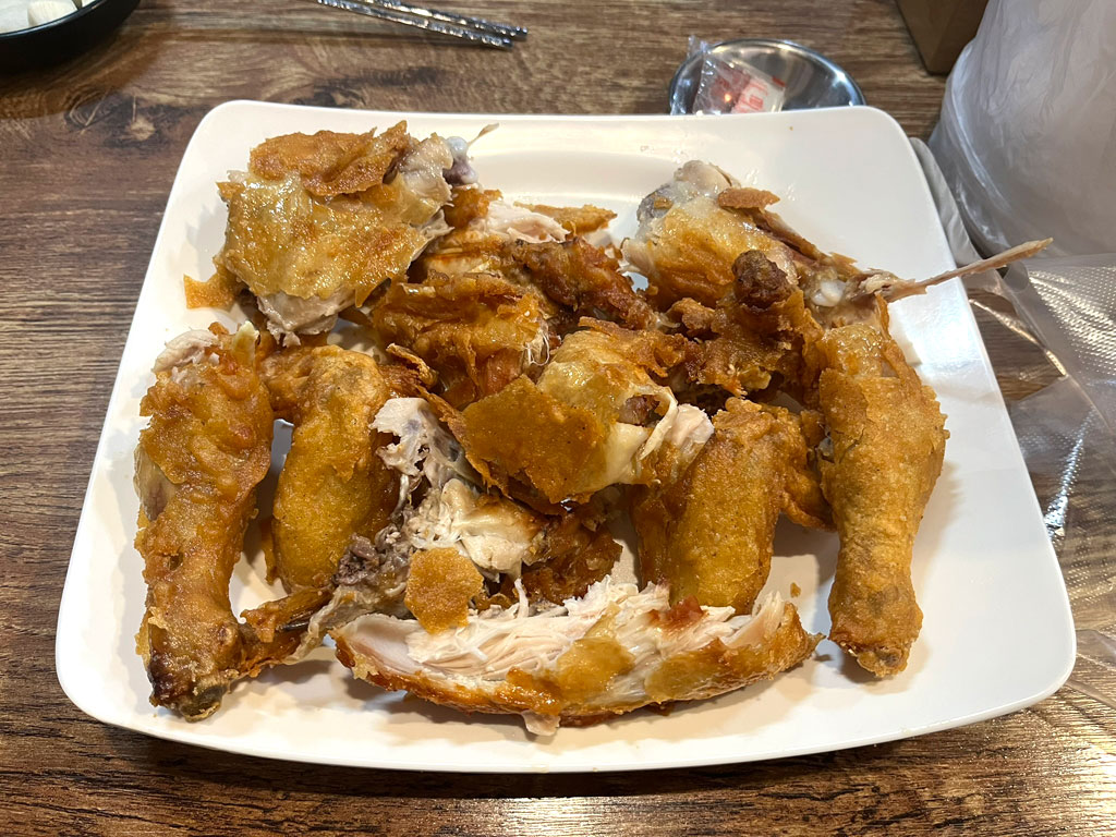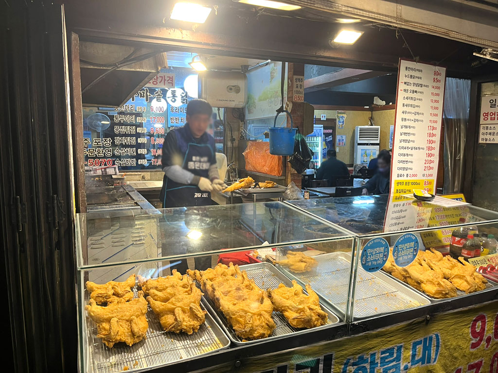 大阪の場末の一杯飲み屋さんの雰囲気で、でも、周りが韓国語ばかりなので、日本の事を忘れて、焼酎とこの揚げ鶏でしっぽりと飲んで。