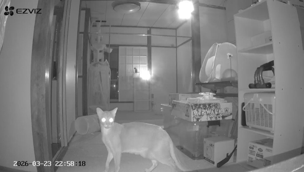 そして、最寄りの駅で、電車を待っている間、Webカメラで自宅を覗いてみると、アビのすけが2階を徘徊してた…。