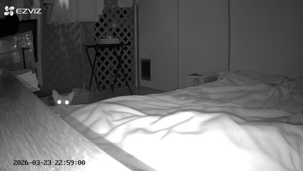 そして、スマホの充電もたっぷりと出来たところで、ちょっとアビのすけのことが気になったので、Webカメラでチャックしてみると、アビのすけ、2階のテレビの方にいました。