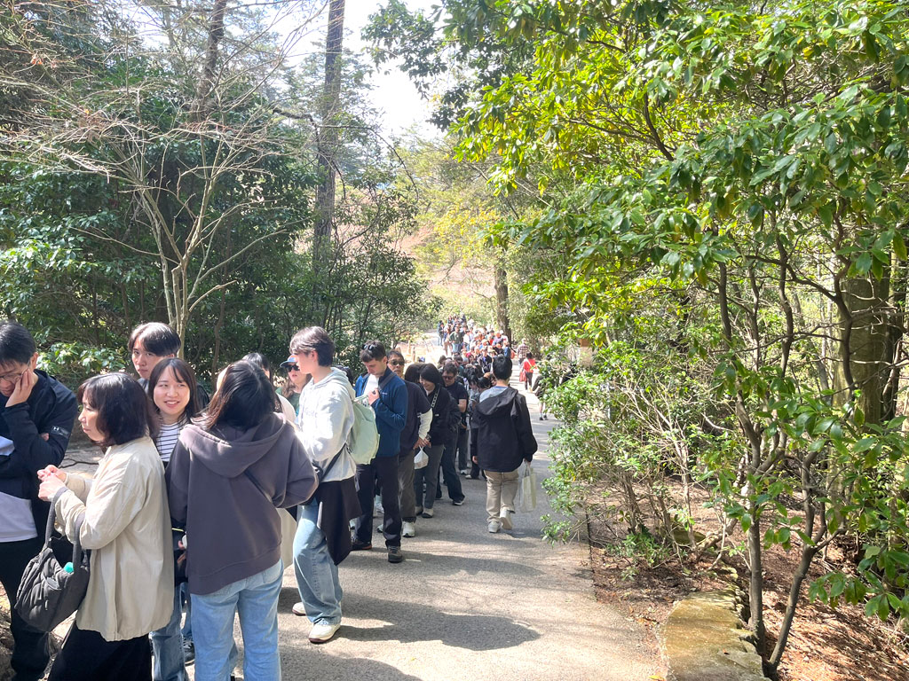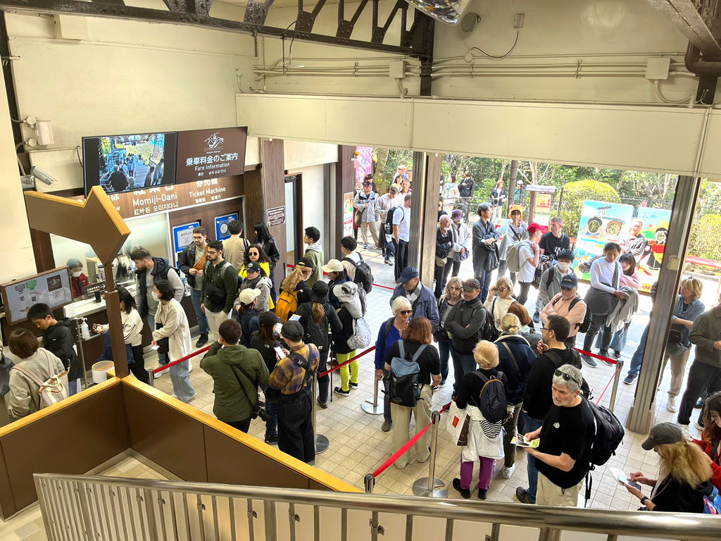 そして、地上の駅の「紅葉谷駅」に着いてみると、恐ろしい程の行列が出来ていて、写真の右の看板に記載がありますが、この場所で「約50分待ち」の状態で。