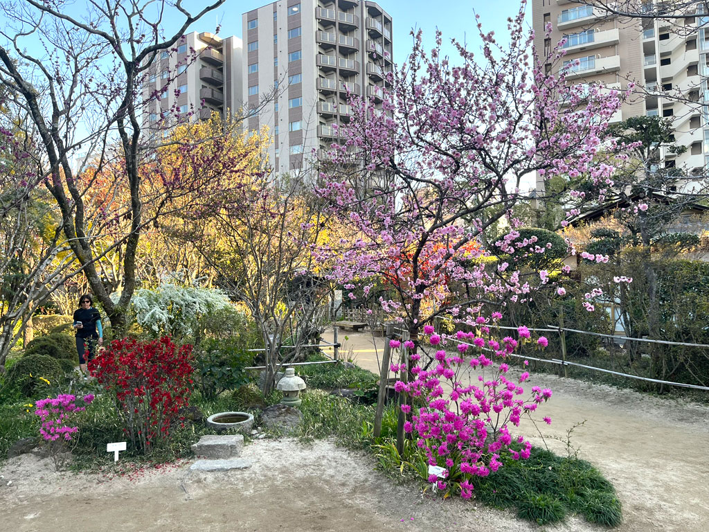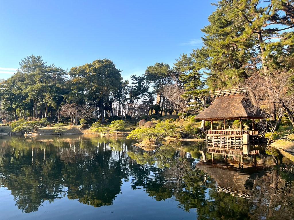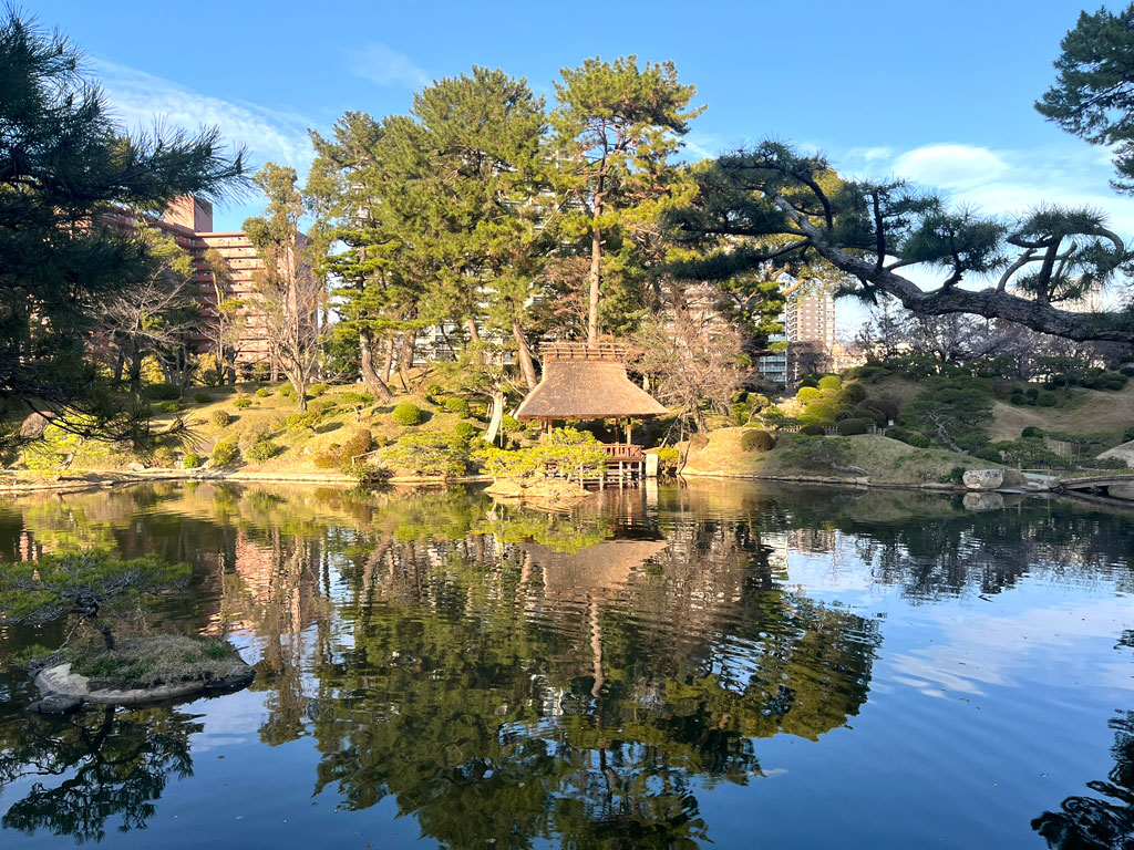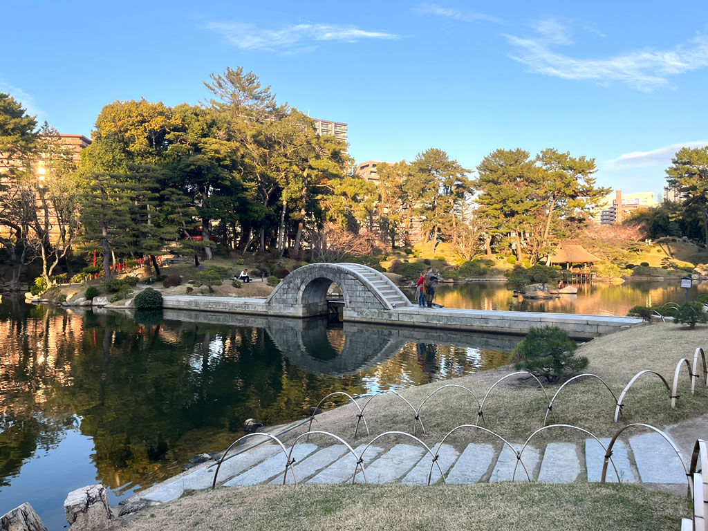 「縮景園」は、広島藩の初代藩主の浅野長晟さんが築成された庭園で、池を中心に、小山や橋、茶室を配した池泉回遊式庭園とのこと。