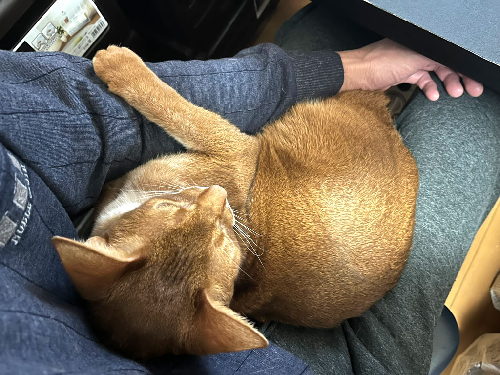 おやつをあげて、ずっと寝るように促していたのですが、私の太ももの上に陣取ってしまい、出発するため、椅子から立ち上がると、アビのすけも私の後を追って来て。