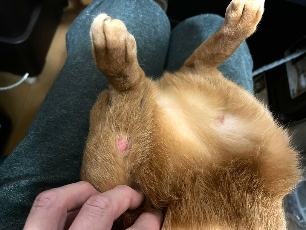 最後、これは、ちょうど2週間前の3/14(土)の晩22時過ぎに撮った写真ですが、久しぶりに、アビのすけに皮膚炎が出来ていました。