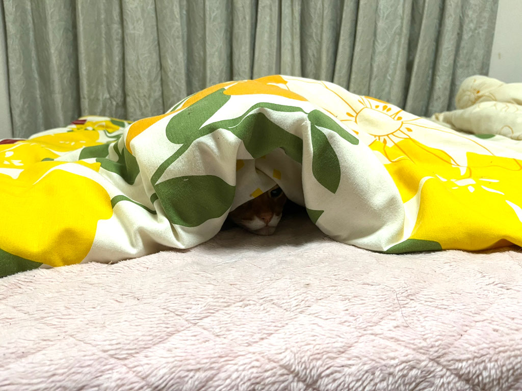 そして、場面は変わりまして、これは、4日前の3/23(月)の晩8時前、アビのすけ、最近にしては珍しく、布団に潜り込んで寝ていました。
