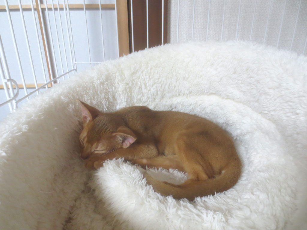 これは、今日の夕方のアビのすけ…、お昼ご飯後、一遊びしてから、ケージの3階の猫ベットでお眠に…。