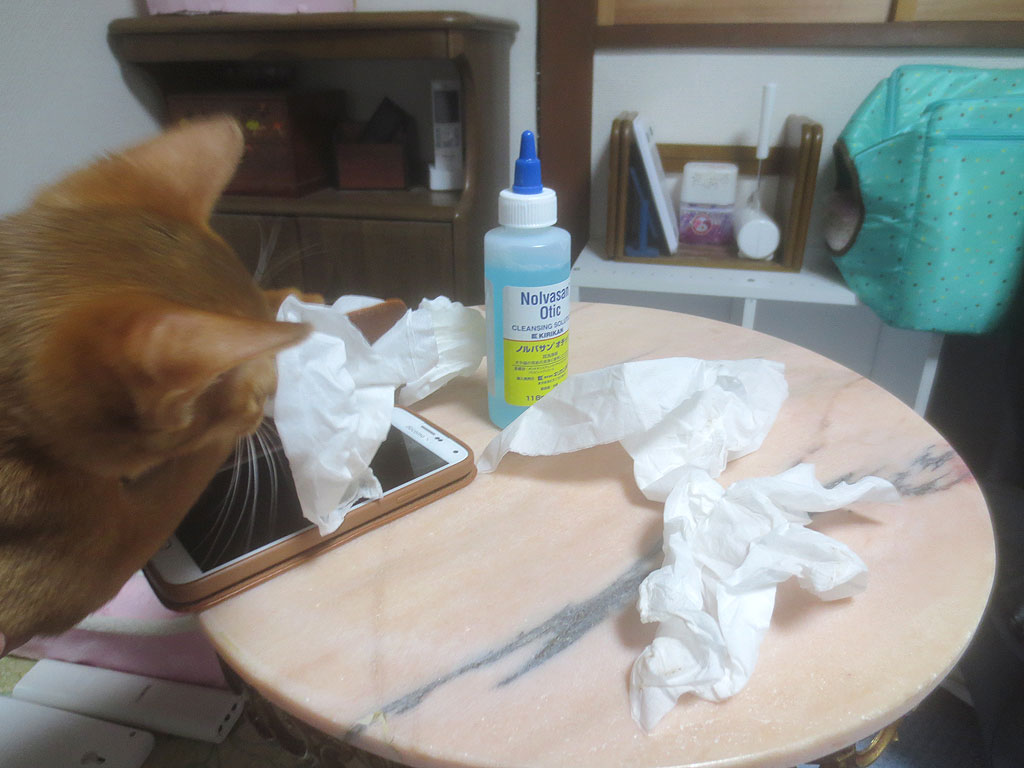 そして、耳の中をクチュクチュして、ティッシュで耳の中を拭いてあげると、この通り、もう、アビのすけの耳の中、ピッカピカになりましたよ。