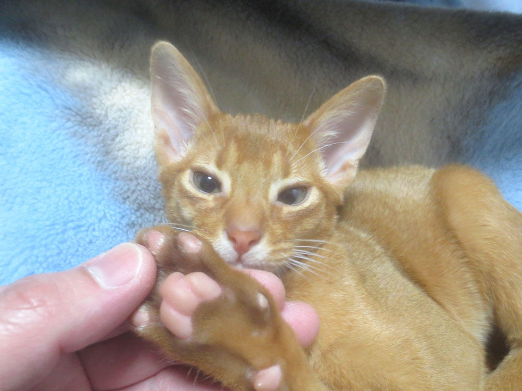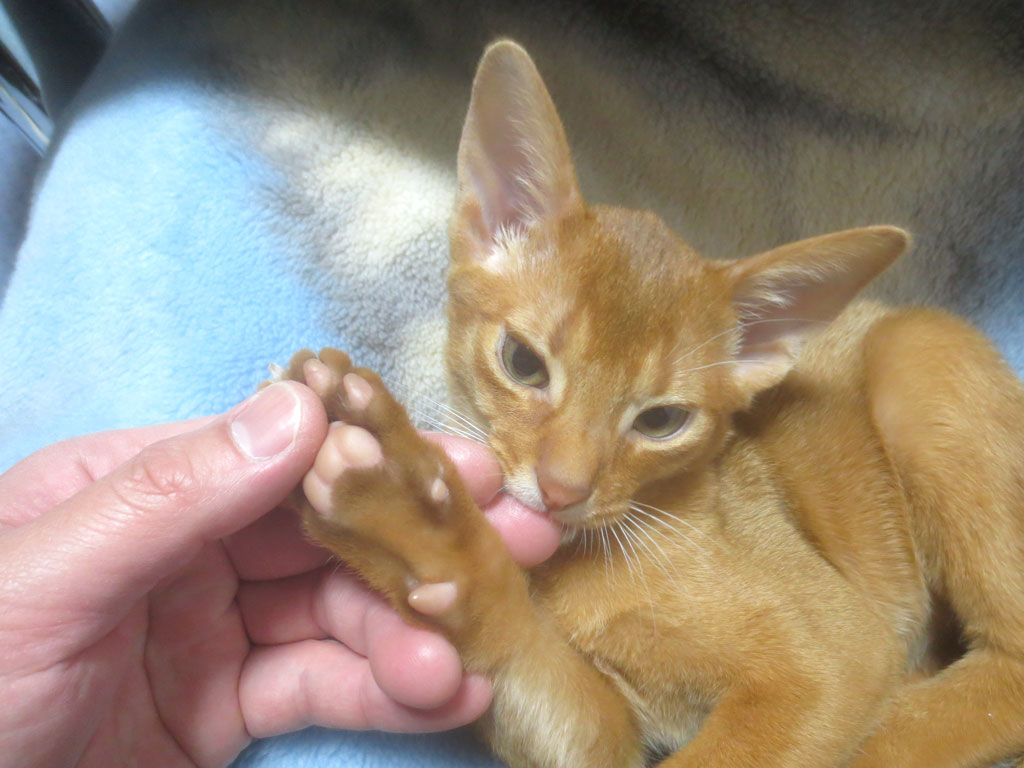 かわいいアビシニアンのアビのすけ。しかし、アビのすけ、素直に肉球を触らせてくれるなんて、なかなか、お利口さんでしょ!