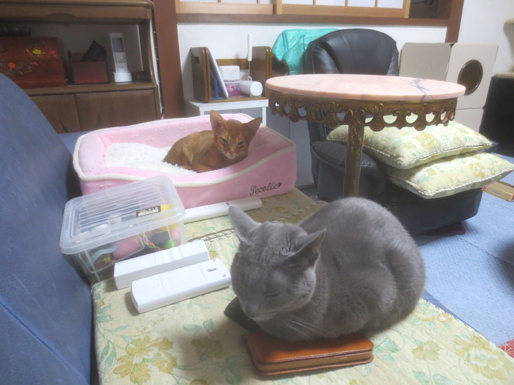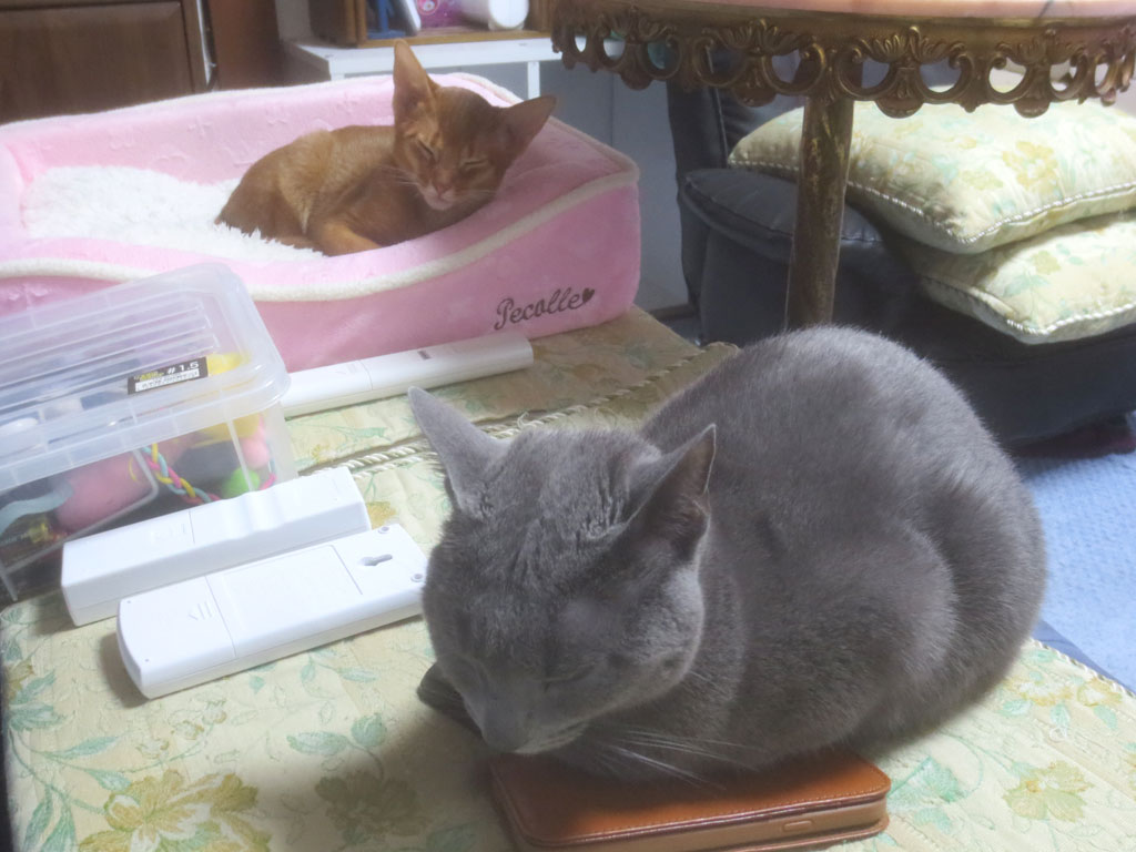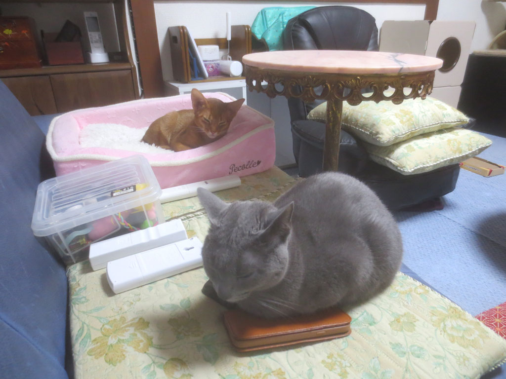 そして、夜も更けて来ると、眠くなって来るロシ子お姉とアビのすけ…、相変わらず、ロシ子お姉はアビのすけに、元、自分の定位置の猫ベットから、追い出されている様ですね…。