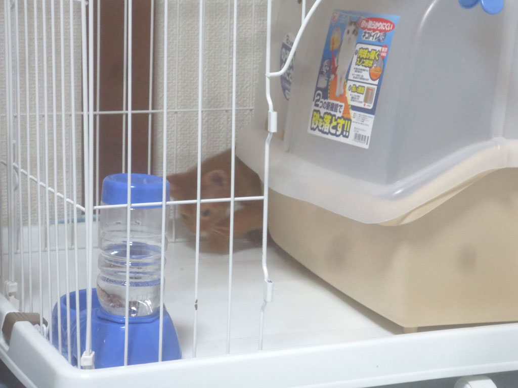 動き回るアビのすけ。トイレの向こうの隙間を潜ったり、出てきたりと、ケージの中を慌ただしく動き回っていたアビのすけですが、もしかしたら、お腹が減って、ご飯を探していたのかな…。