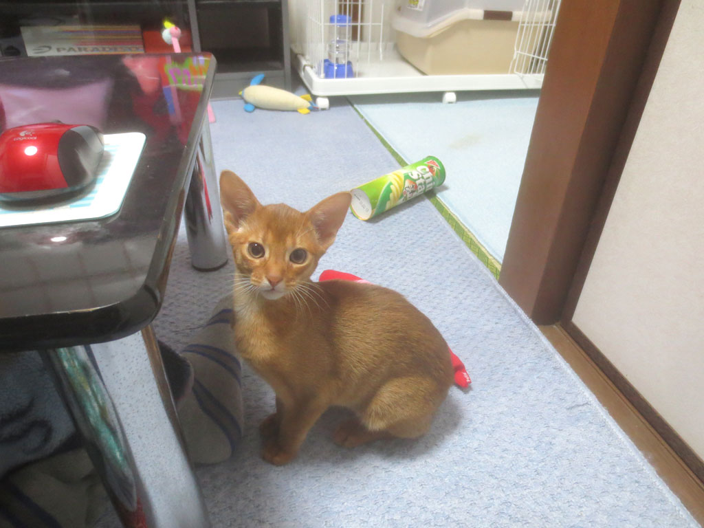 人懐こいアビシニアン。そして、その日の晩のアビのすけ…、やっぱりアビシニアンって、ブリーダーさんからも聞いていた通り、本当に人懐っこいですね。
