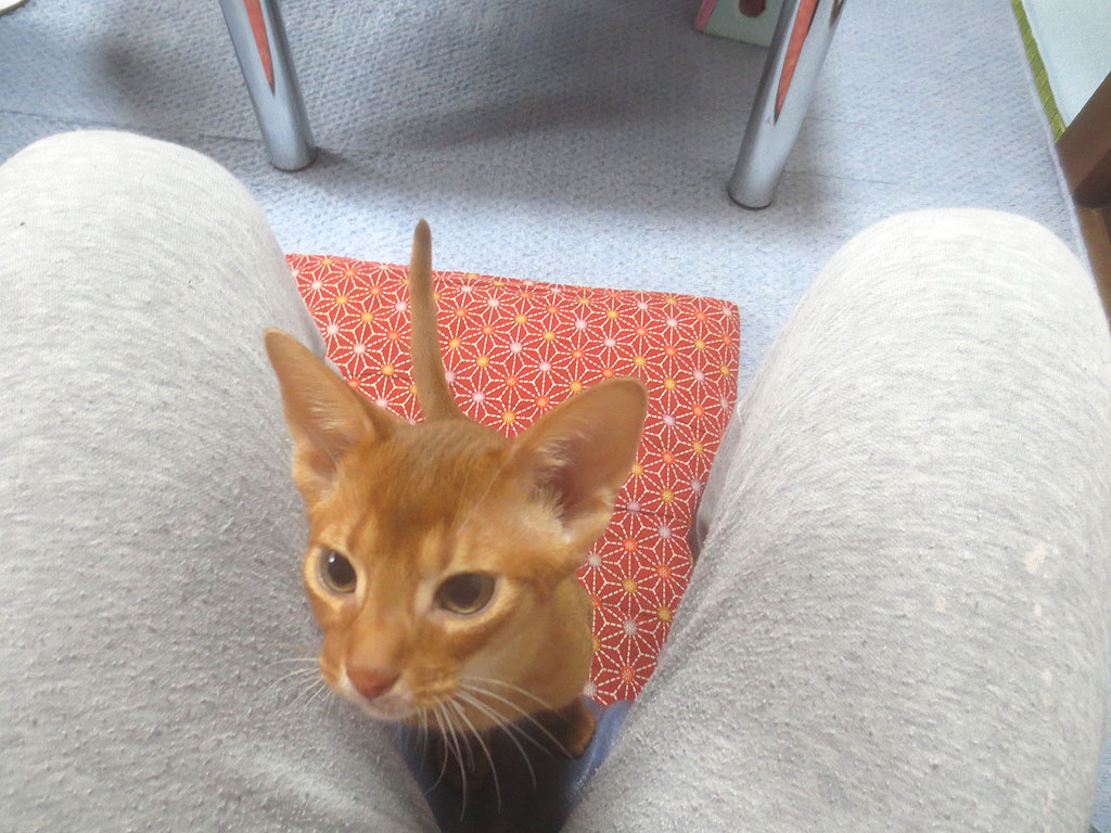私の膝の上に乗って来るアビのすけ。これは、もう、毎晩の事ですが、アビのすけの定位置となるつつある、私の膝の上で寛ぐアビのすけ