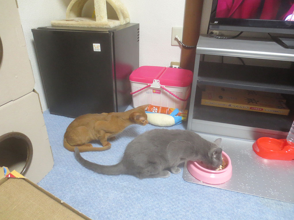 いつも、2にゃんにご飯をあげる時は、まず、先住のロシ子とコミュニケーションを取って、ロシ子にご飯をあげて、その後に、アビのすけとコミュニケーションをとって、アビのすけにご飯をあげて、っていう流れなのですが、自分のご飯を待ちきれないアビのすけは、ロシ子のご飯が欲しくって、欲しくって、こんなに首が伸びてるんです。