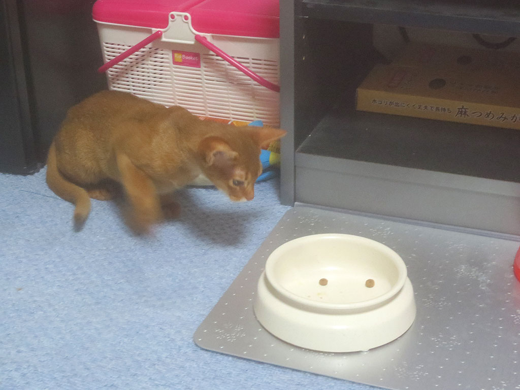 そして、この写真は、おとといのアビのすけの様子…、またもや、ロシ子が残した数粒のカリカリに興味を持って…。