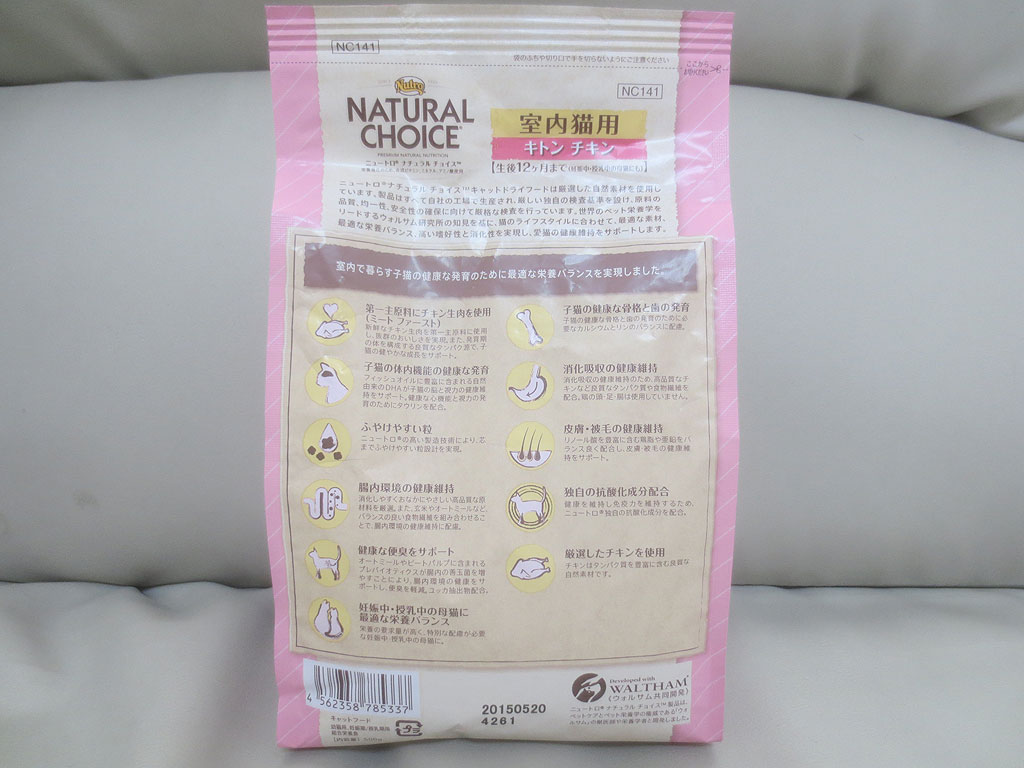 先日、ロイヤルカナンのキトンの10kgの袋を買ったので、このニュートロのキトンチキンは、それまでのつなぎになりますが、これは、100g当り、400kcalのカロリー量ですね。