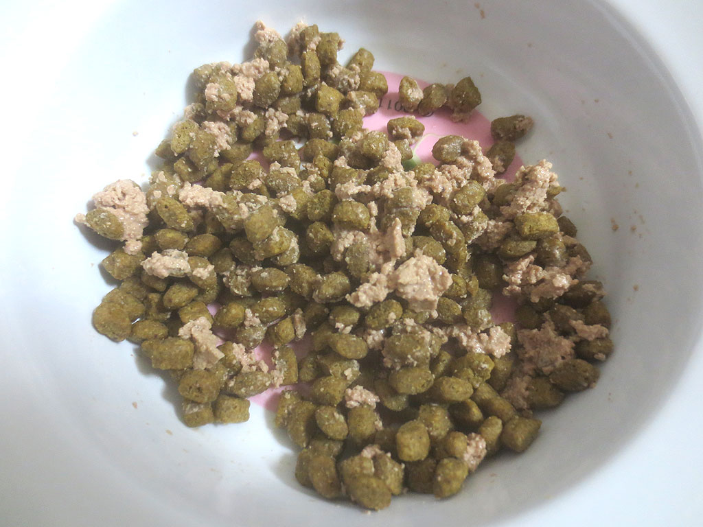 アビのすけにとっては、初めてのニュートロになるので、突然、味が変わったら、食べてくれないかもって、少しだけ思ったのですが、まぁ、いつもの缶詰も合わせているし、アビのすけは食いしん坊なので、大丈夫だろうと高を括って準備して…。