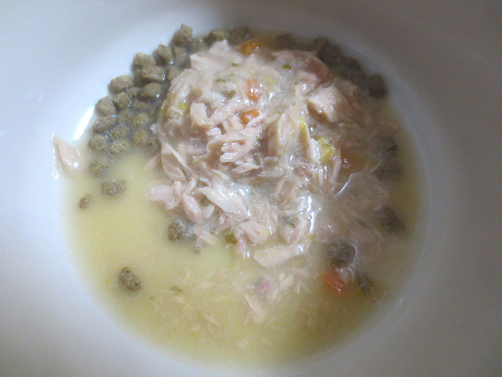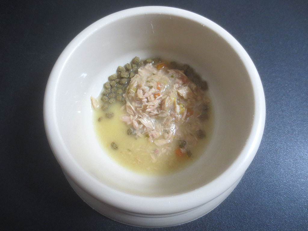 アビのすけのスペシャルご飯。まぐろスープのパウチ約42gに、カリカリを3gだけ加えた、アビのすけの為のスペシャル昼ご飯です。