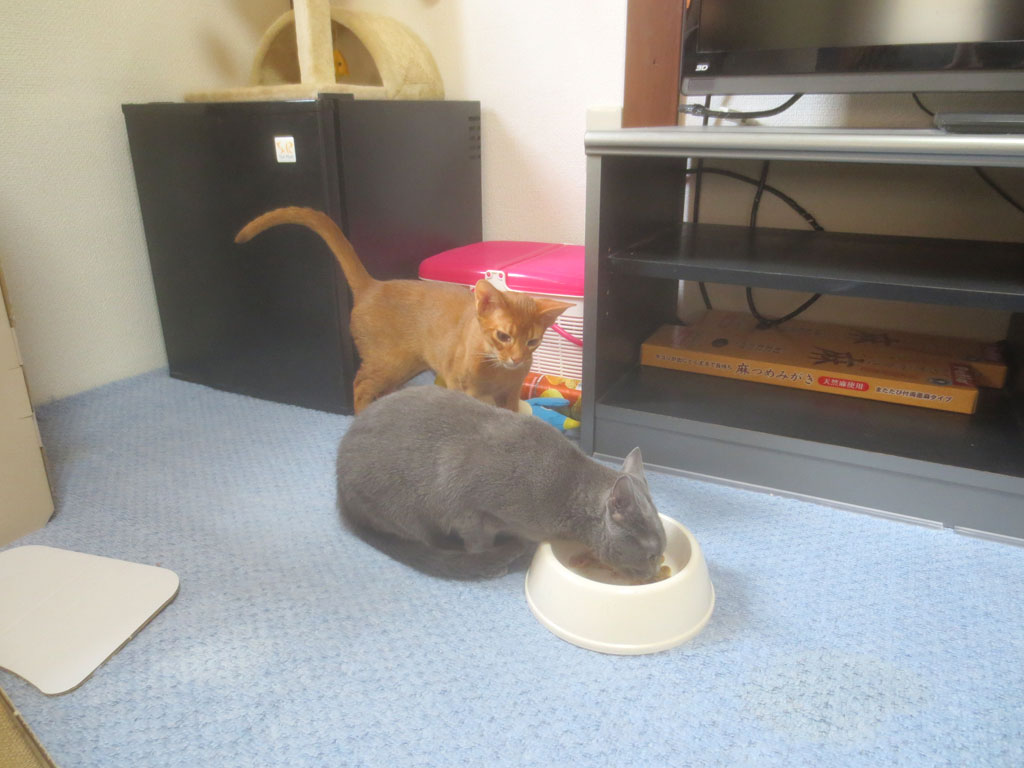 いつもの通り、まず、先住のロシ子と鼻チューしてからご飯をあげて、その後、アビのすけにもご飯をあげようと「アビのすけぇー」って呼んだのですが、アビのすけは目の前のロシ子のご飯に興味津々で、私がアビのすけを呼んでる声なんか、全く、耳に入っていなかったのです。