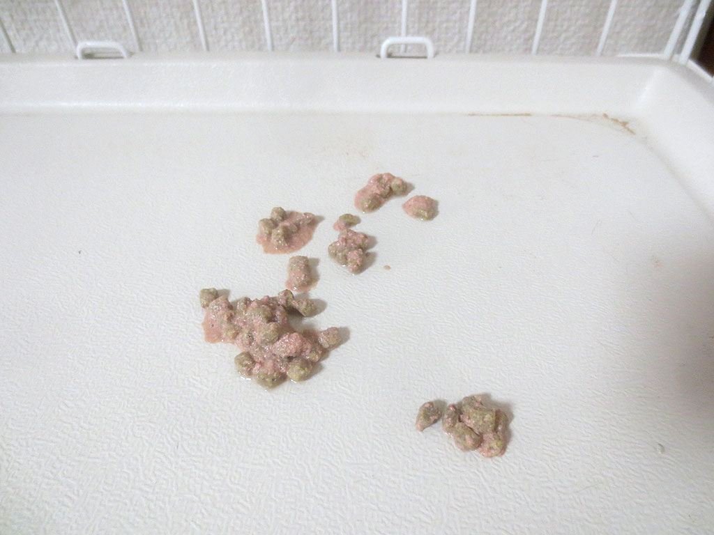 ケージの2階で吐いたアビのすけ。ケージの中の3階で餌付いた後、また、せわしなく動いていたアビのすけだったのですが、2階に降りた時に、また餌付いてしまって、それで、耐えきれずに吐いてしまいました…。