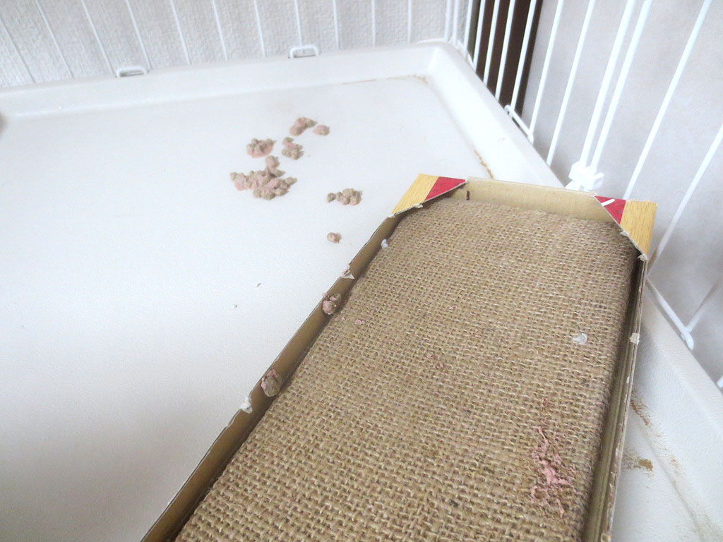 私もこれには対応が出来なくって、素早く爪研ぎを取ったのですが、爪研ぎの上にも、少し、吐かれてしまって…、でも、まぁ、仕方がない…。