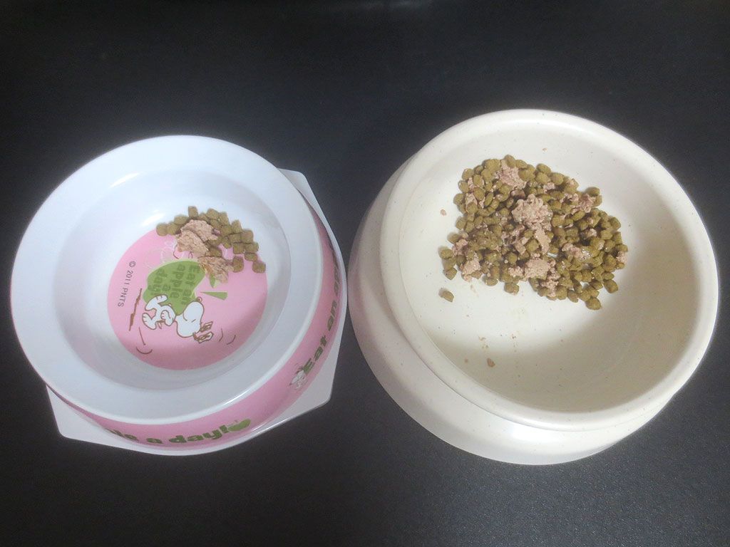 そしてこれは、今朝のアビのすけの朝ご飯…、1回目ご飯は左側、缶詰2gとカリカリ2gの計4g、そして右側は2回目ご飯で、缶詰が12gとカリカリ18gの合計30g。