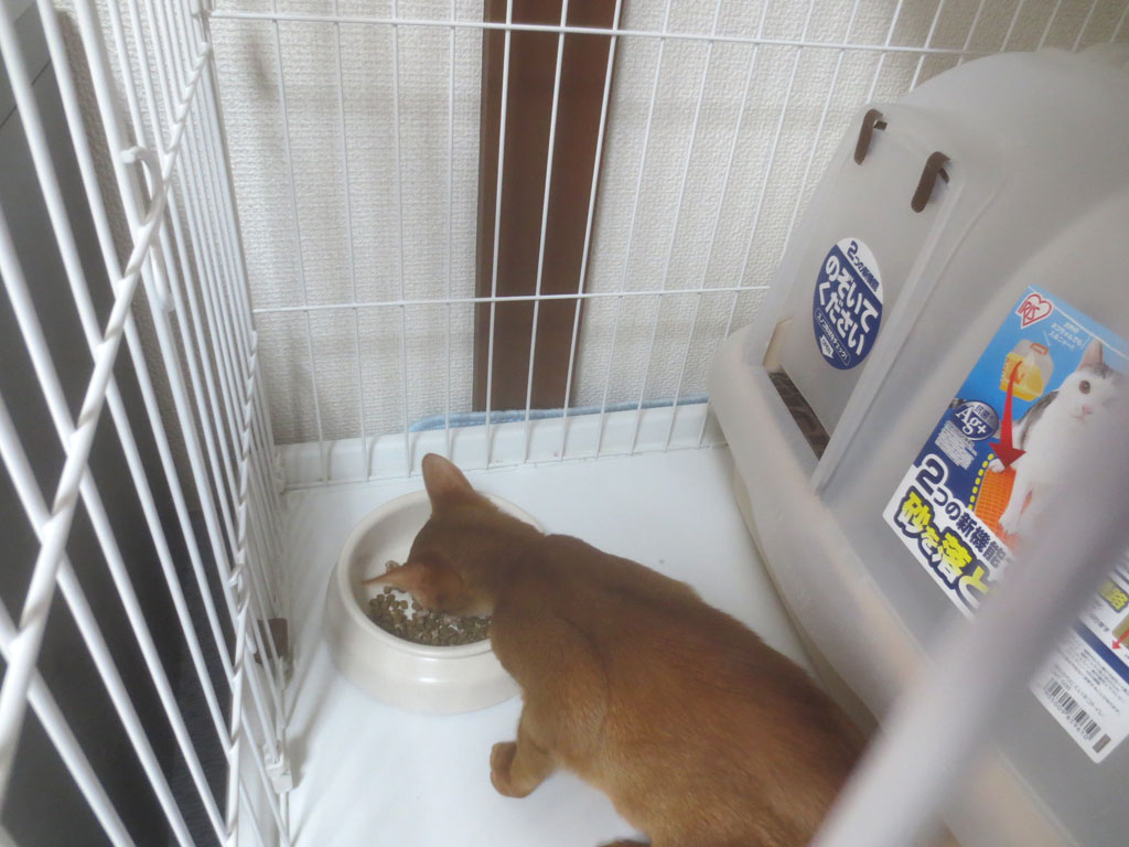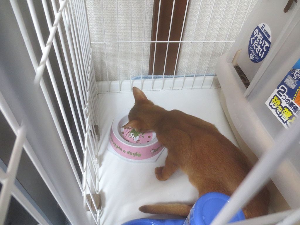 1回目ご飯を食べるアビのすけ、もうガツガツ、ガツガツ…。