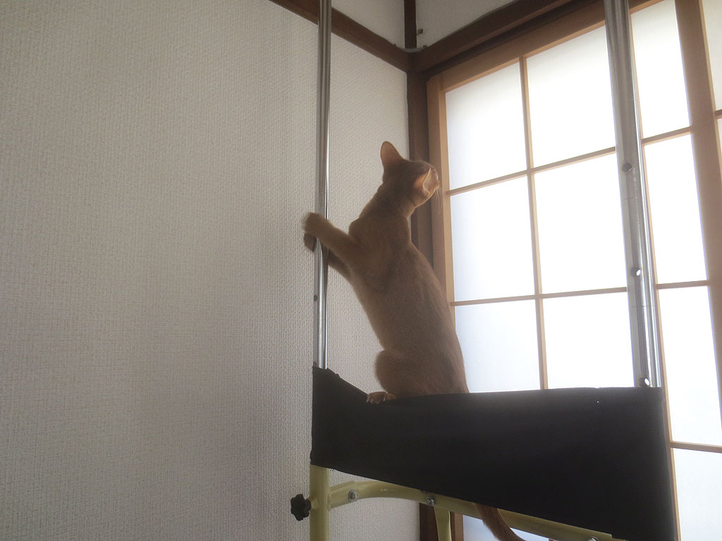 これは、買ったものの、全然、私がぶら下がっていなかったぶら下がり健康器を、アビのすけが利用してくれていた様子です。