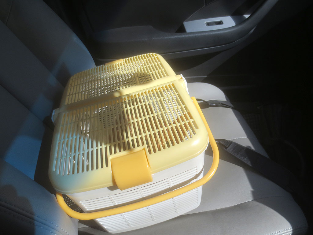 これは車の中のアビのすけの様子…、相変わらず、籠の中で、鳴いて暴れていましたよ。