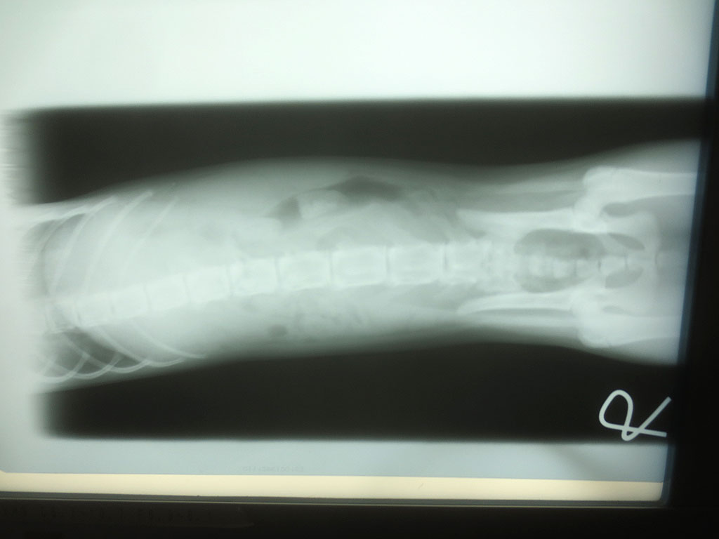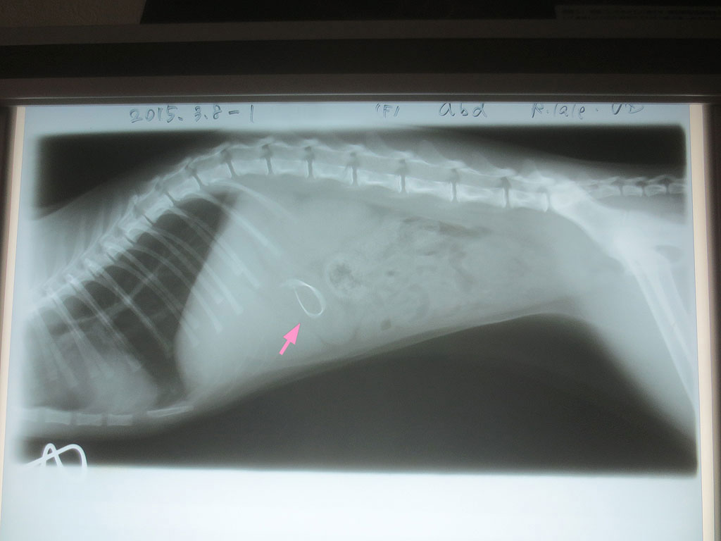 そして、レントゲン写真の現像が終わって、その写真を見させて頂いたのですが、これは前回のレントゲン写真…、前にもアップしたのですが、胃の中に異物があって、これが移動していたかどうかなのですが…。