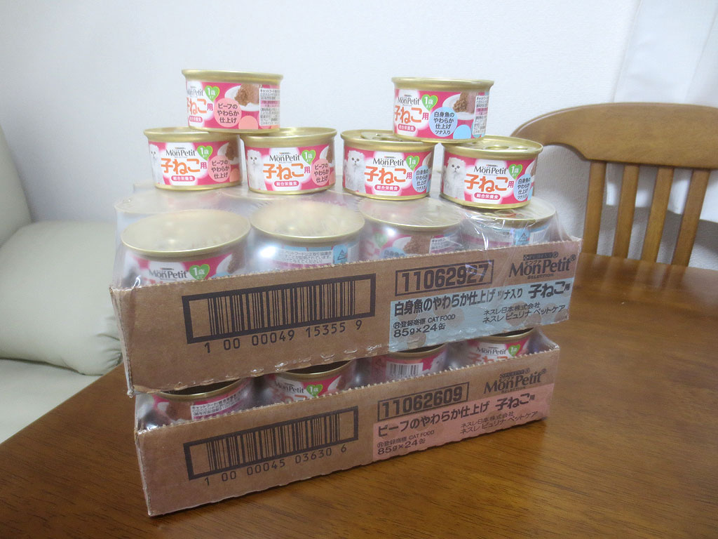 これは、アビのすけの為のモンプチの子猫用の缶詰…、ビーフと白身魚の2種類の味があるのですが、今ある分も合わせて、これでアビのすけが1歳になるまでは、もう缶詰を買わなくても良い計算なのです。
