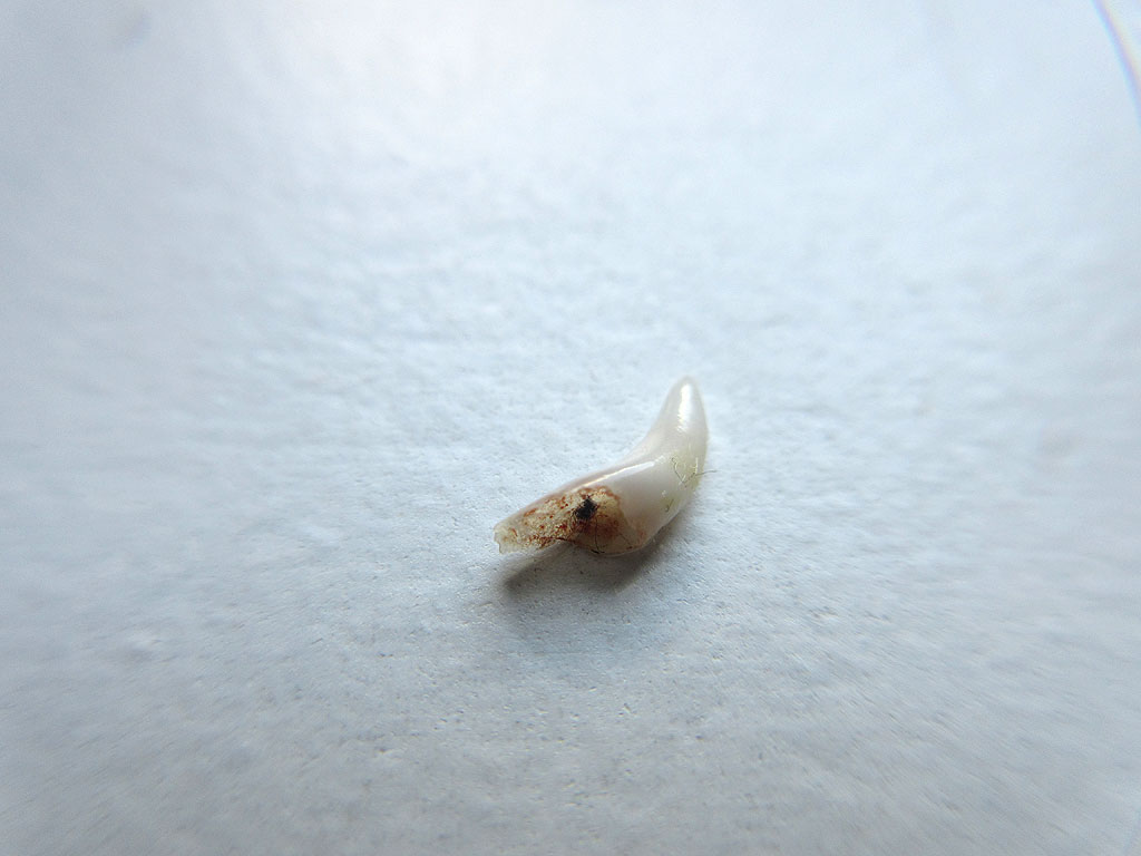 ロシ子の時の歯は、こんな牙ではなくて、形から見て少し奥の歯だったと思うのですが、今回のアビのすけの歯は犬歯ですね…、やったー…。