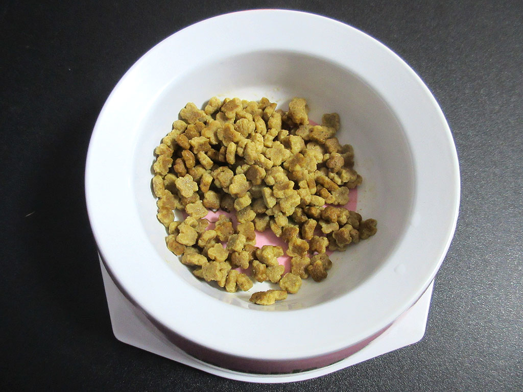 これは今日のアビのすけの朝ご飯…、カリカリをふやかすのも今日が最後のつもり…。