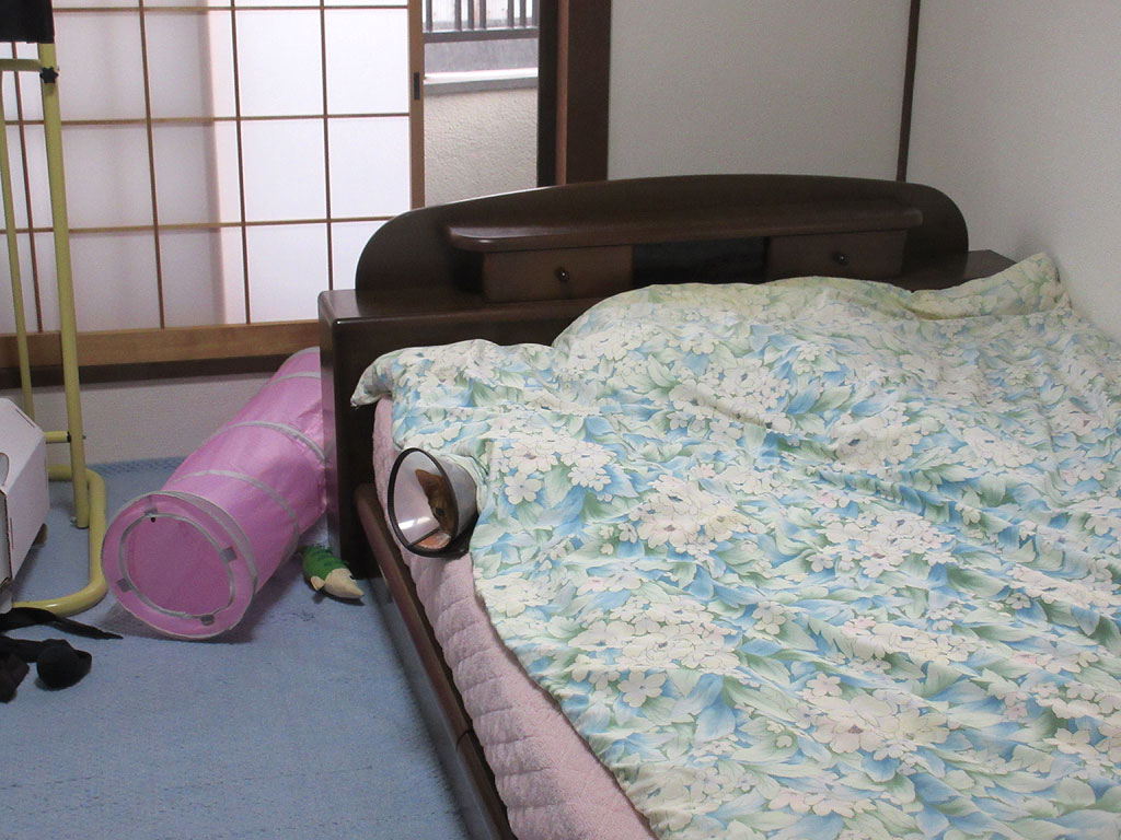 これは昨日の朝のアビのすけ…、アビのすけは面白い奴で、よく、こうして頭だけ出して寝ているんです。