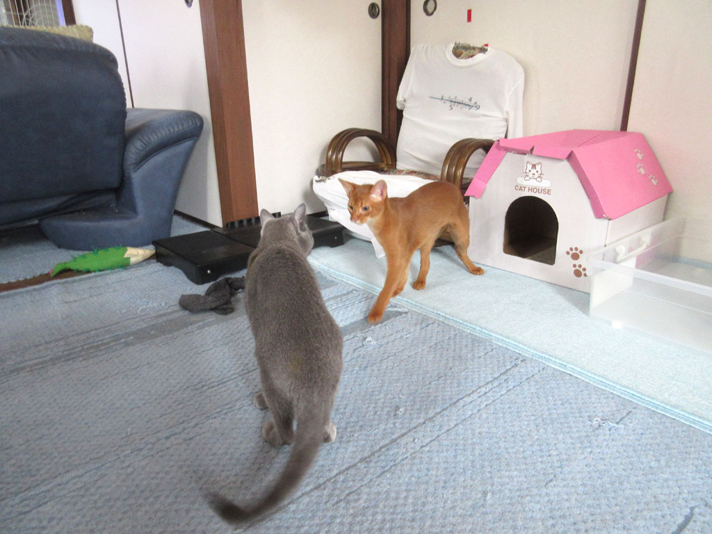 元気なロシ子とアビのすけ。(昨晩からして)明後日には動物病院に行って、真菌が治ったという良い診察結果を、動物病院の先生から聞かせて頂けると思っていたので、昨日の晩からロシ子アビのすけのエリザベスカラーを外してあげているのですが、ロシ子アビのすけも見違える様に元気に走り回って、今日も楽しそうに遊んでいたんです。