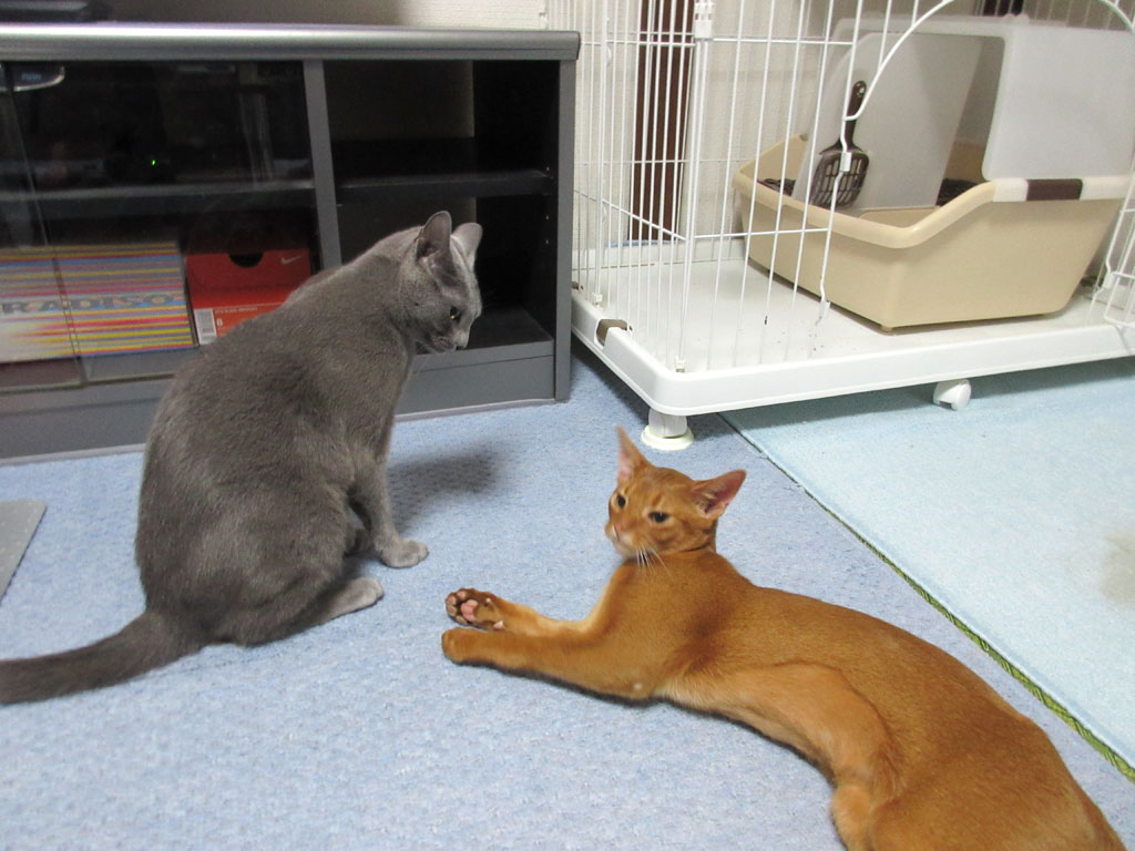 アビのすけは子猫なので、もうすっかりロシ子にも慣れてしまって、一緒に遊びたそうなのですが、ロシ子は大人の猫ちゃんなので、まだそこまではアビのすけに心を許していないのかな…。
