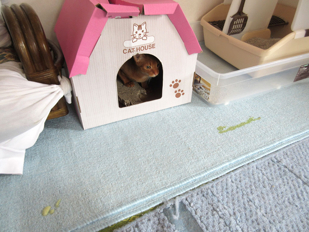 今朝、私がケージの中の猫たちのトイレを掃除していたら、私の背中の方で、何かしゃっくりをするかの様な声が聞こえたので、こっちの部屋の方を覗いてみましたら、アビのすけが吐いていたのです。