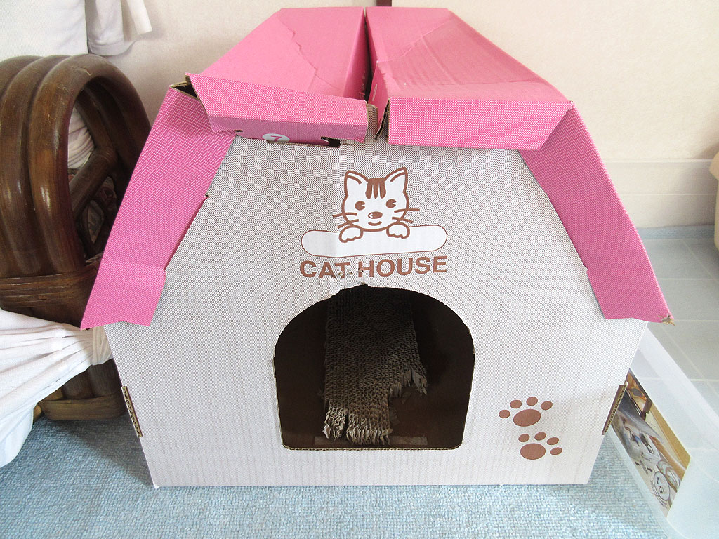 このダンボールハウスも安くで買った物なので、ダンボール自体が薄い事もあって、潰れかけてしまっていますね。