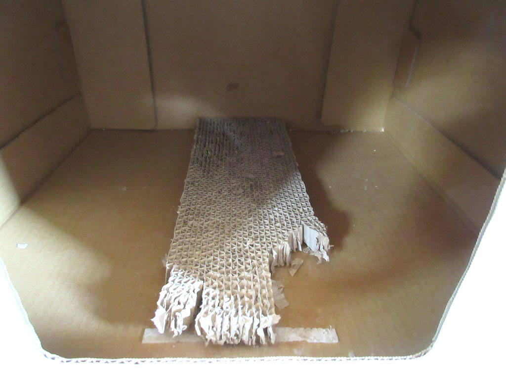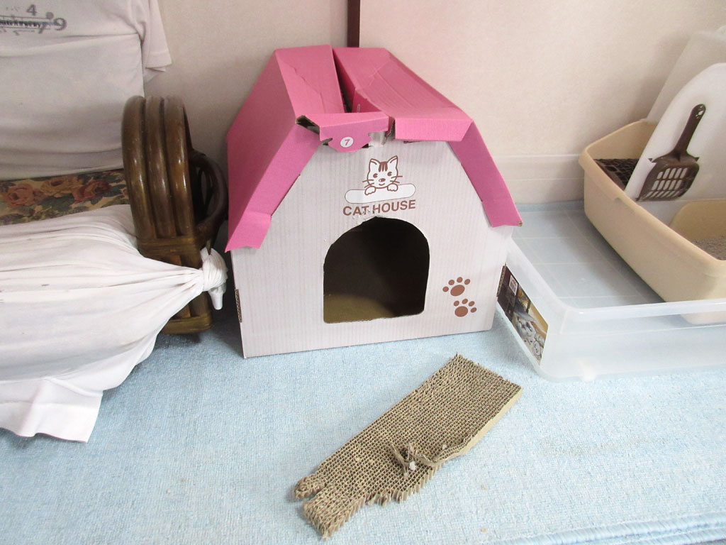 ダンボールハウスの中の爪研ぎ。このダンボールハウスの中には爪研ぎが入っていて、ロシ子もたまにこの爪研ぎで爪を研いでくれているので、私的には有難い爪研ぎなのですが、日頃、アビのすけがこの爪研ぎを噛み噛みしてるんですよね…。