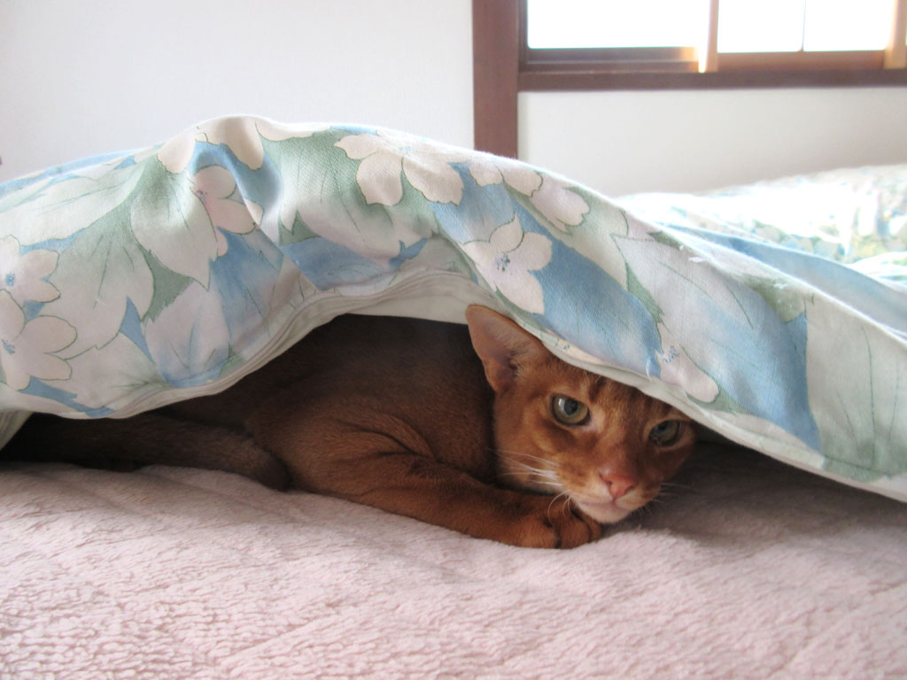 隠れているアビのすけ。朝、ロシ子のブラッシングが終わって、次、アビのすけにブラッシングをしようと思ってアビのすけを探したら、ここに隠れていたんです…、アビのすけ、嫌な事をされるのから逃げる為に、こんなに分かりやすい所に隠れてるの、面白いやん…。(笑)