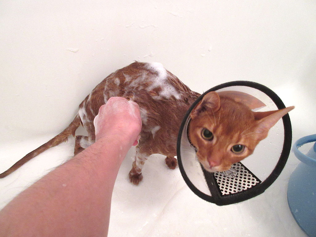 そして、あちこち動き回るし、手をパタパタしてシャンプーを撒き散らすので、アビのすけにはエリザベスカラーをはめているので、アビのすけの目には入らないのですが、私にはいっぱいシャンプーが飛んで来るのです…、でも仕方がない…。