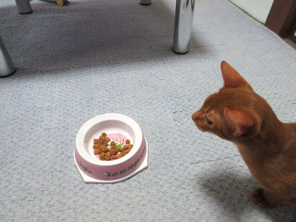 これは、昨日の晩のアビのすけの様子…、昨日、ロシ子にマラセブでのシャンプーをしたので、ロシ子にお利口さんご飯をあげたのですが、新しい種類のカリカリを食べてくれなかったロシ子…、そのロシ子のご飯を狙っていた、食欲バリバリのアビシニアンの男の子、アビのすけだったのです。