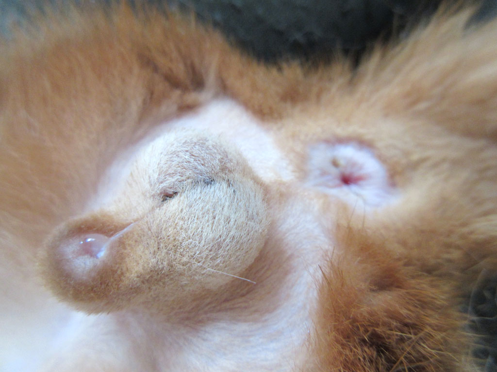 この角度からの方が、メスで切った玉の裏側が見えるので患部が見やすいのですが、アビのすけは尻尾をブルンブルンさせるので、良い写真が撮りにくいのです…。